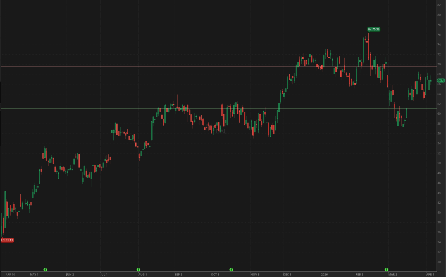 Price is currently sitting in the middle of a range defined by recent gaps, and IV rank remains elevated above 70, driven by the macro and earnings uncertainty. The earnings expected move is about $4, or roughly 6%. If a trader is comfortable with the risk, they may look to take advantage of the volatility crush by selling options ahead of the report. As for me, I’m waiting for a break of the range.