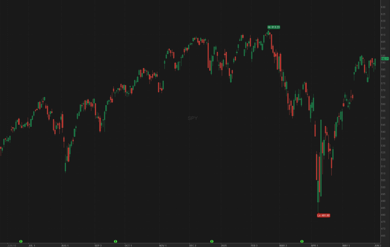 The S&P 500 (via SPY) started strong last week but ultimately traded in a wide range between ~$578 and ~$593. Most of the gains came after the long Memorial Day weekend, with the index finishing up ~2.35% from the Friday, May 23 close to the Monday, June 2 close. That said, momentum appears to be fading. Bulls will want to see continued strength this week or, at minimum, for the price to hold above $585. Meanwhile, bears will be eyeing a break below the May 23 low of $575.60 to regain control. We may need a catalyst to break the current range. I’ll keep you posted on what unfolds.